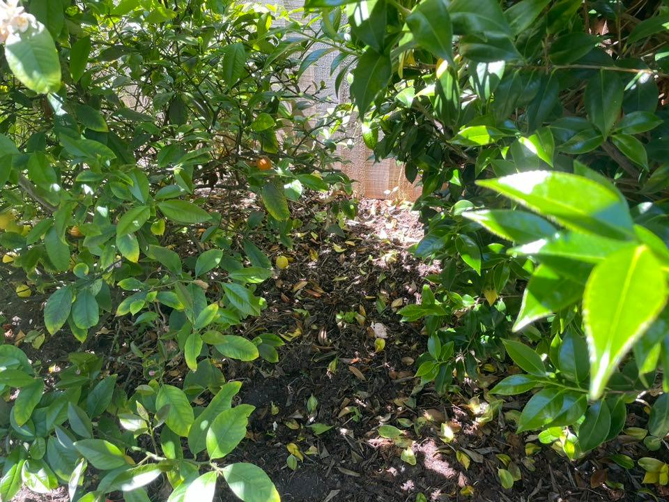 No mushroom activity between the lemon and camellia trees, but I do spy a little lemon.
