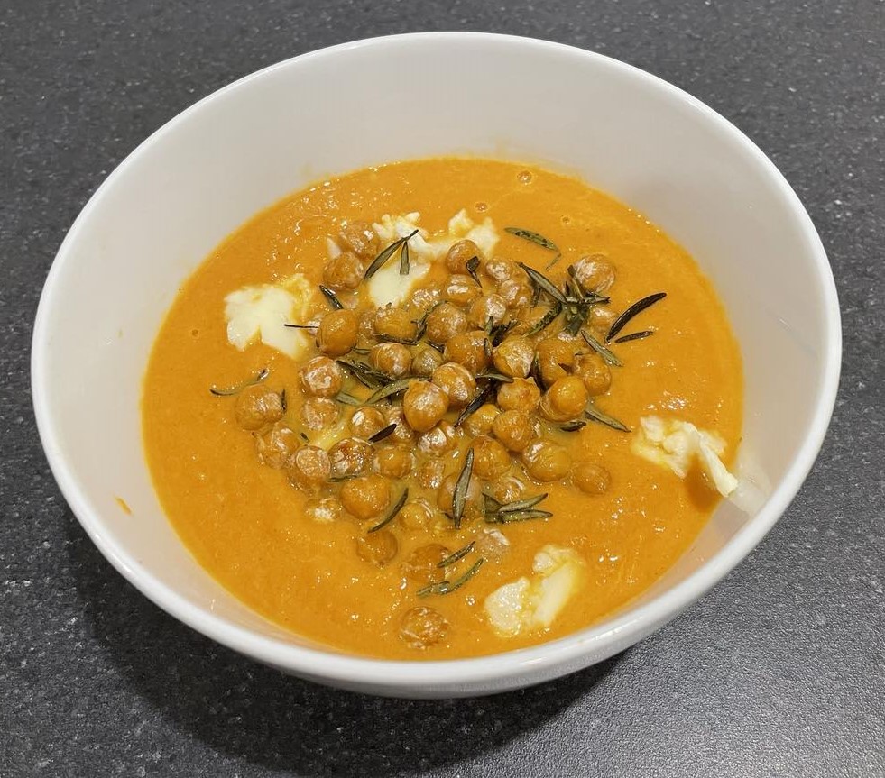 The two – okay, three – things I did a little differently to the recipe (because who doesn’t do that?) was to use apple cider vinegar instead of sherry vinegar, but a little less. And I didn’t cook the carrots with the tomatoes, but added the tomatoes at the end of the cooking. I was a wee bit suspicious about being instructed to cook the carrots in with the tomatoes, as some vegetables don’t cook properly when they’re in with tomatoes, and I couldn’t remember if carrots were amongst those. I also put a few dabs of vegan cream cheese on the top of the soup, instead of the remainder of the tahini listed in the ingredients. The rosemary part was a cinch, though, and followed strictly to the recipe, as I have a bush outside my front door, compliments of sis.