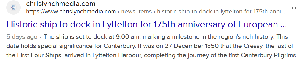 It started off when I spotted a news item in Chris Lynch Media about the arrival of a sailing ship into the Port of Lyttleton, which services Christchurch and a good portion of the South Island. Apparently, a historic Dutch tall ship called the Oosterschelde was scheduled to dock at 9am on 27th Dec, which was the same day as the Cressy came into port in 1850 carrying 155 immigrants to New Zealand from the UK. The Cressy was the last of what are referred to as the First Four Ships to bring immigrants to Canterbury NZ, which was a planned settlement.